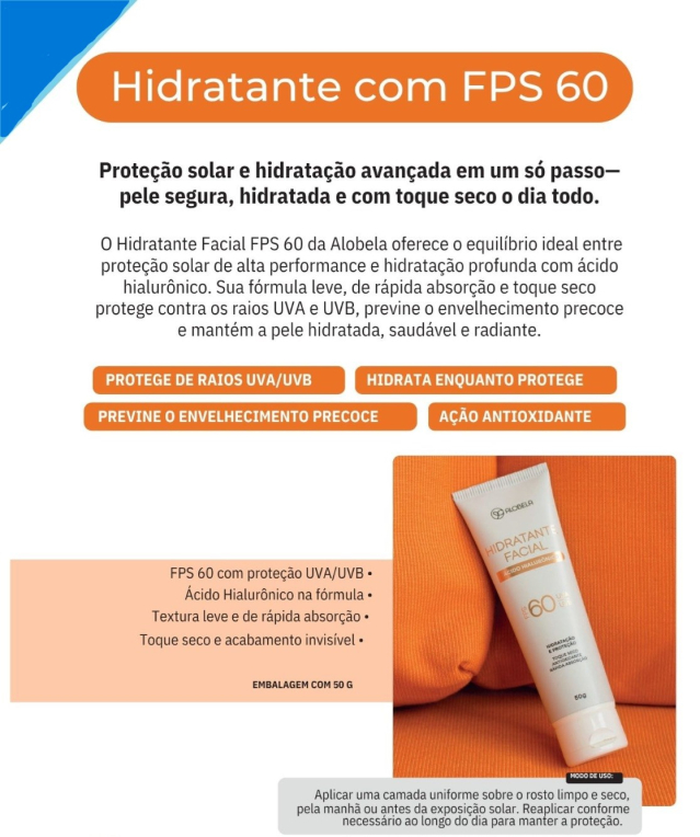 | O Hidratante Facial FPS 60 da Alobela oferece o equilíbrio ideal entre proteção solar de alta performance e hidratação profunda com ácido hialurônico. Sua fórmula leve, de rápida absorção e toque seco protege contra os raios UVA e UVB, previne o envelhecimento precoce e mantém a pele hidratada, saudável e radiante. Modo de Uso Aplicar uma camada uniforme sobre o rosto limpo e seco, pela manhã ou antes da exposição solar. Reaplicar conforme necessário ao longo do dia para manter a proteção. |
