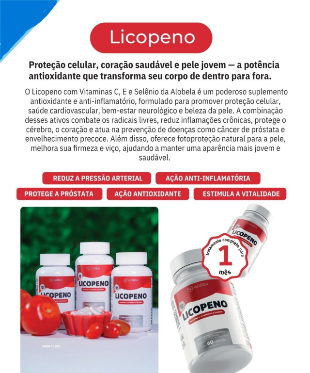 | O Licopeno com Vitaminas C, E e Selênio da Alobela é um poderoso suplemento antioxidante e anti-inflamatório, formulado para promover proteção celular, saúde cardiovascular, bem-estar neurológico e beleza da pele. A combinação desses ativos combate os radicais livres, reduz inflamações crônicas, protege o cérebro, o coração e atua na prevenção de doenças como câncer de próstata e envelhecimento precoce. Além disso, oferece fotoproteção natural para a pele, melhora sua firmeza e viço, ajudando a manter uma aparência mais jovem e saudável. Ingredientes Licopeno de tomate, ácido ascórbico (vitamina C), acetato de D-alfa-tocoferol (vitamina E), selenito de sódio (selênio), antiumectantes talco, estearato de magnésio e dióxido de silício. NÃO CONTÉM GLÚTEN. Modo de Consumo Ingerir 2 cápsulas ao dia, de preferência com as refeições, ou conforme recomendação profissional. |